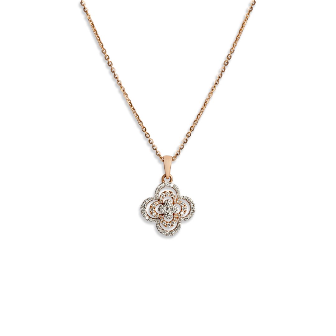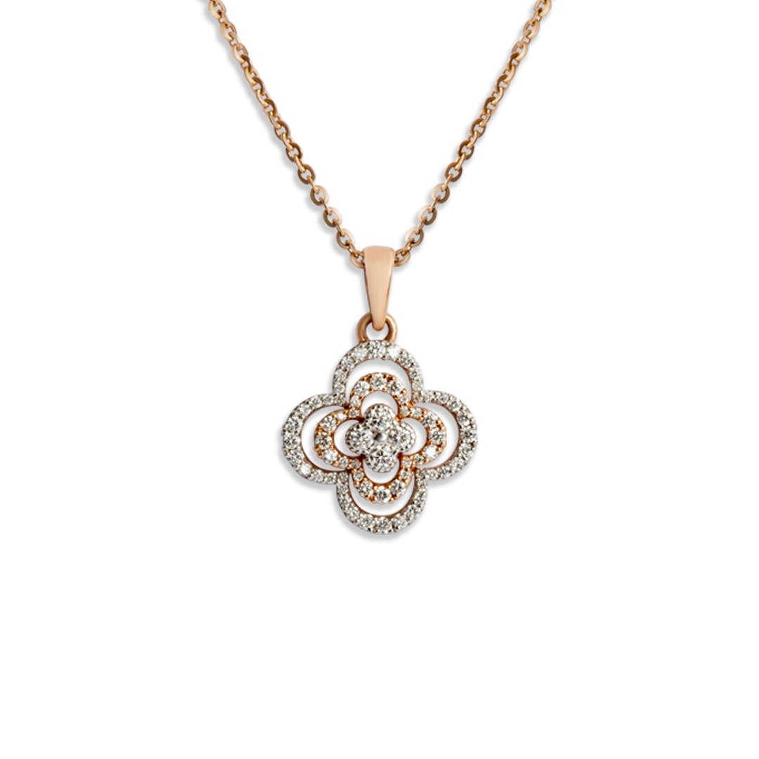 Celebrate elegance and grace with this stunning Diamond Clover Pendant Necklace, a symbol of luck, love, and timeless beauty. Expertly crafted in 14K rose gold, this pendant features a mesmerizing four-leaf clover-inspired design, adorned with brilliant round-cut diamonds that sparkle with every movement. The delicate interwoven pattern adds depth and sophistication, while a dazzling diamond cluster at the center enhances its radiance.