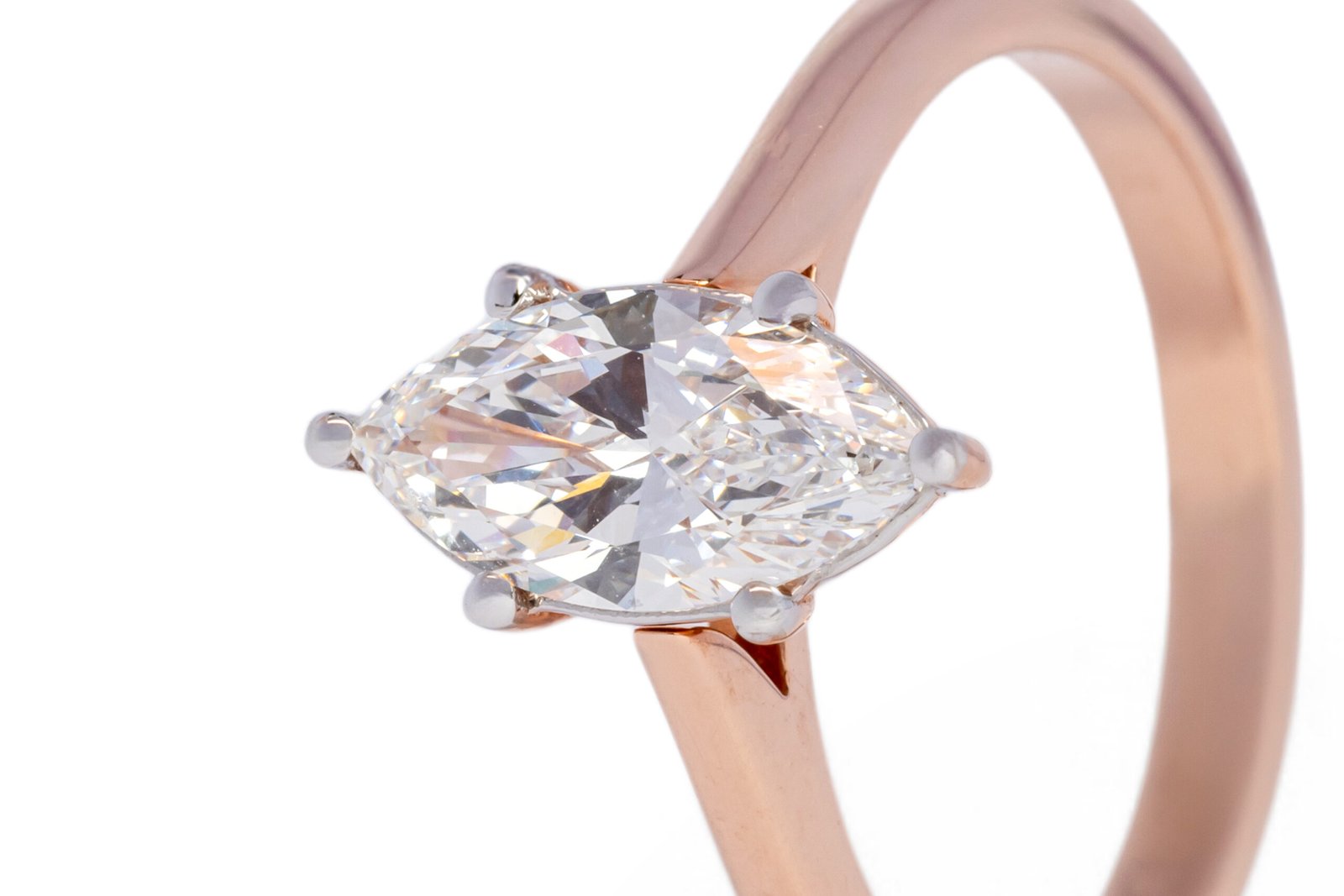 This stunning solitaire ring features a dazzling marquise-cut diamond, a timeless design that exudes elegance and sophistication. Set in a sleek rose gold band, the unique shape of the marquise diamond enhances its brilliance and creates a captivating look.