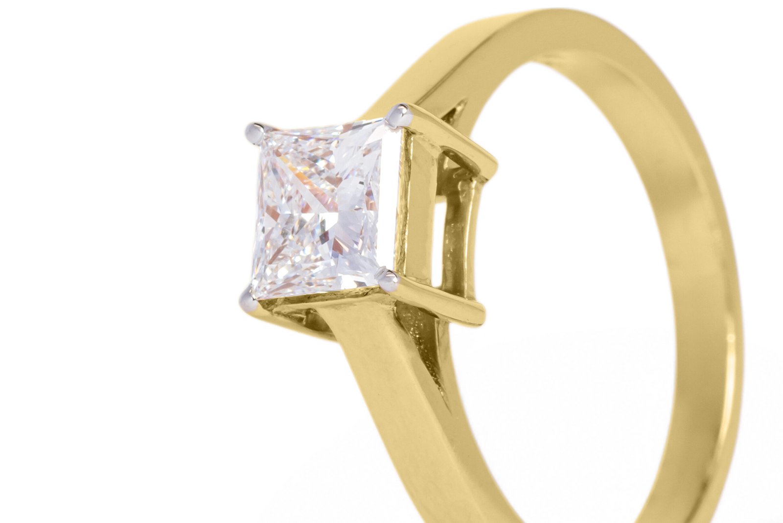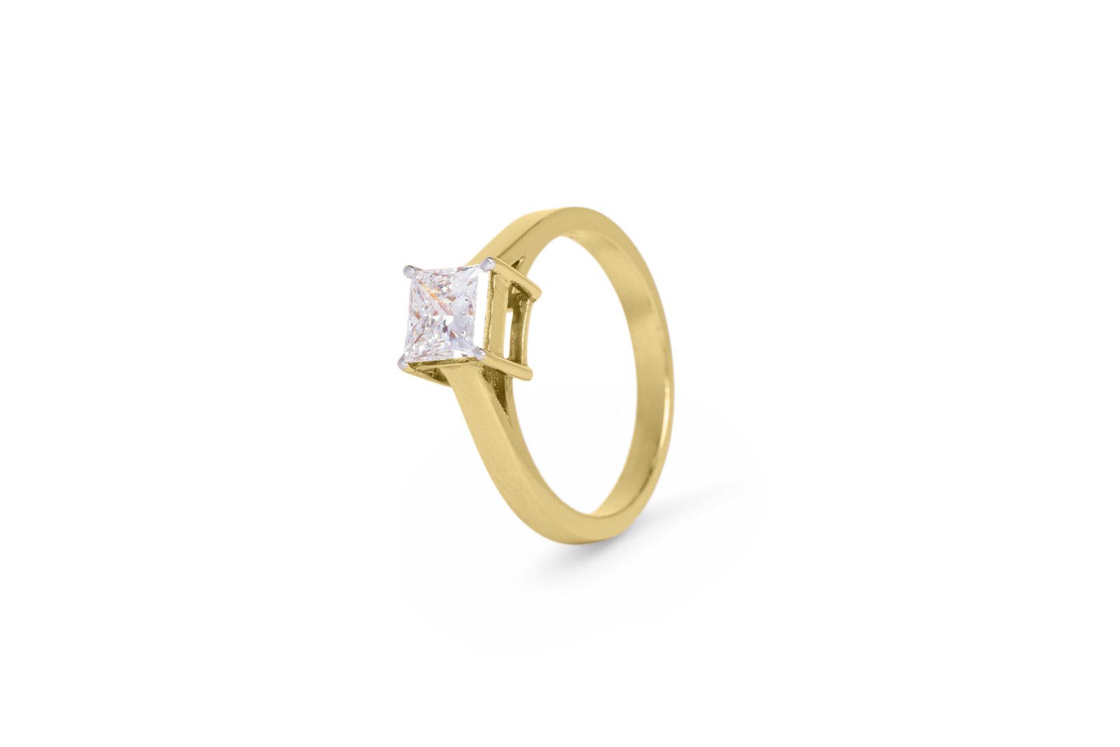 Experience the epitome of sophistication with this stunning princess-cut diamond solitaire ring. The center diamond, renowned for its sharp edges and modern brilliance, is expertly set in a four-prong design to showcase its radiant sparkle.