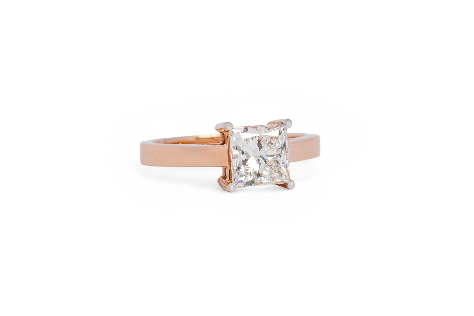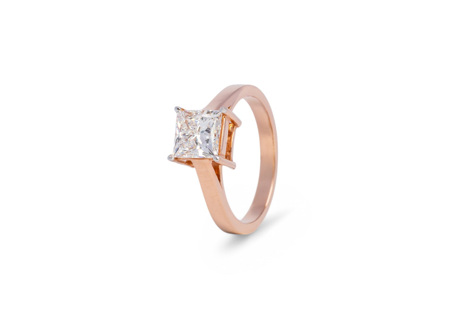 Celebrate elegance and simplicity with this stunning rose gold engagement ring, featuring a radiant princess-cut diamond as its centerpiece. The bold yet refined four-prong setting enhances the diamond’s brilliance, allowing it to take center stage. The sleek, tapered band in warm rose gold complements the timeless design, offering a modern twist to a classic solitaire ring. Perfect for those who value sophistication and enduring style, this ring is a timeless symbol of love and commitment.