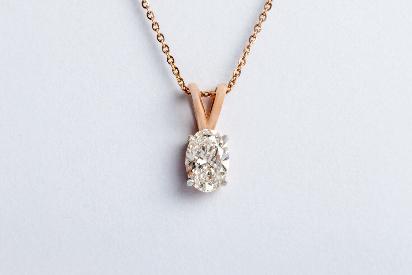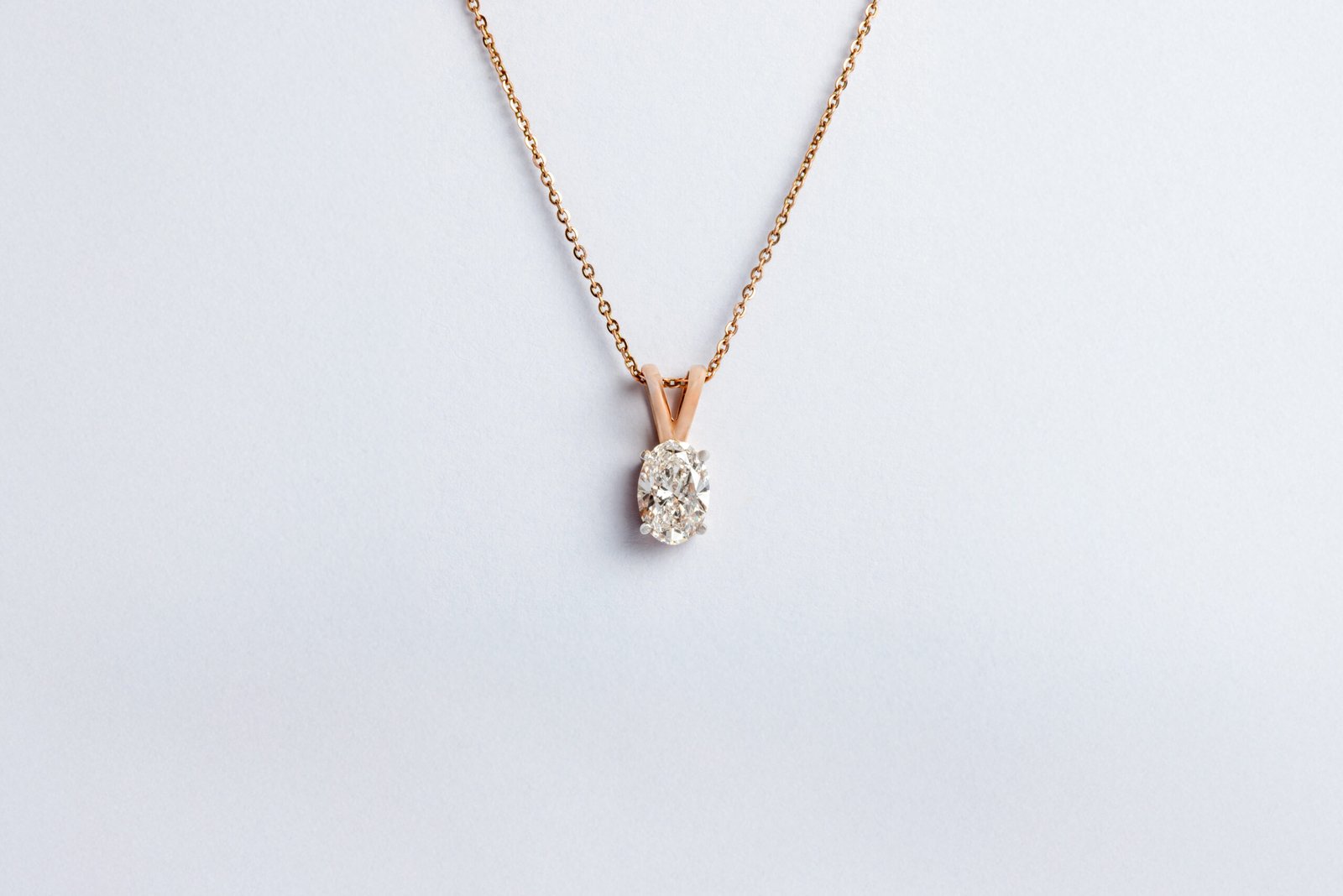 Grace your neckline with this exquisite oval-cut diamond pendant, a timeless masterpiece that embodies sophistication and luxury. The brilliant oval diamond is expertly set in a sleek four-prong setting, allowing maximum light to enhance its natural sparkle. Suspended from a delicate rose gold chain, the pendant’s refined elegance makes it a versatile accessory for both everyday wear and special occasions.